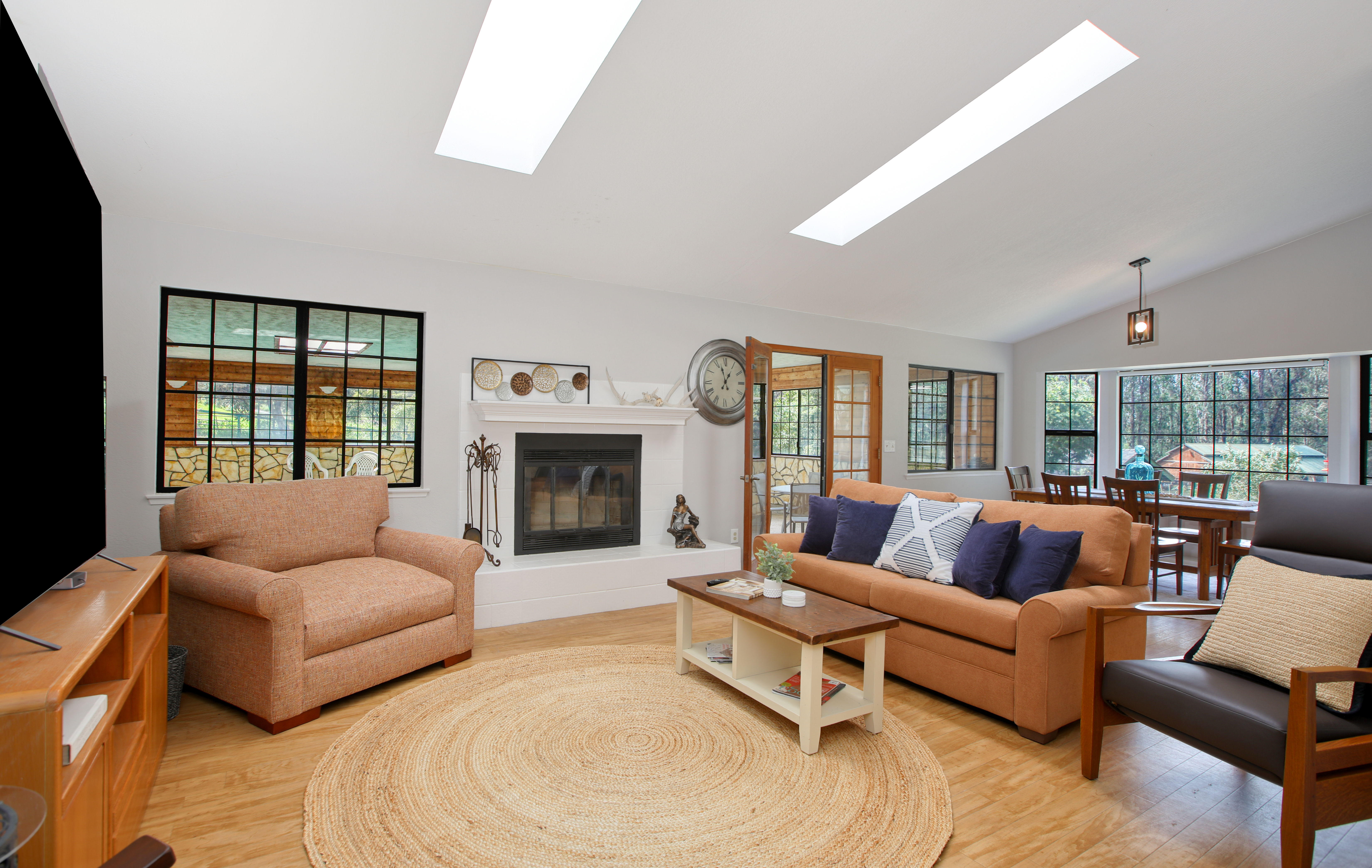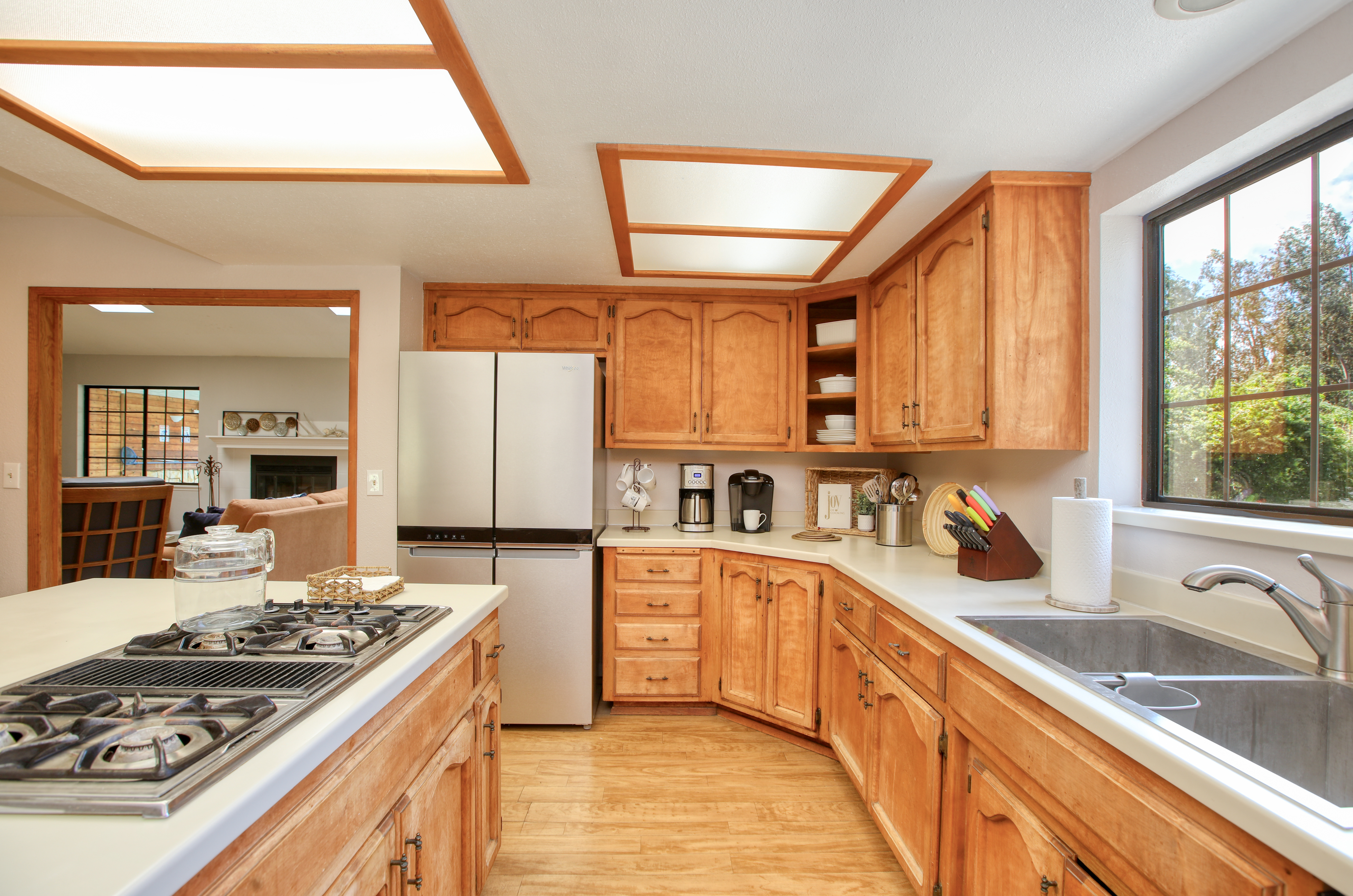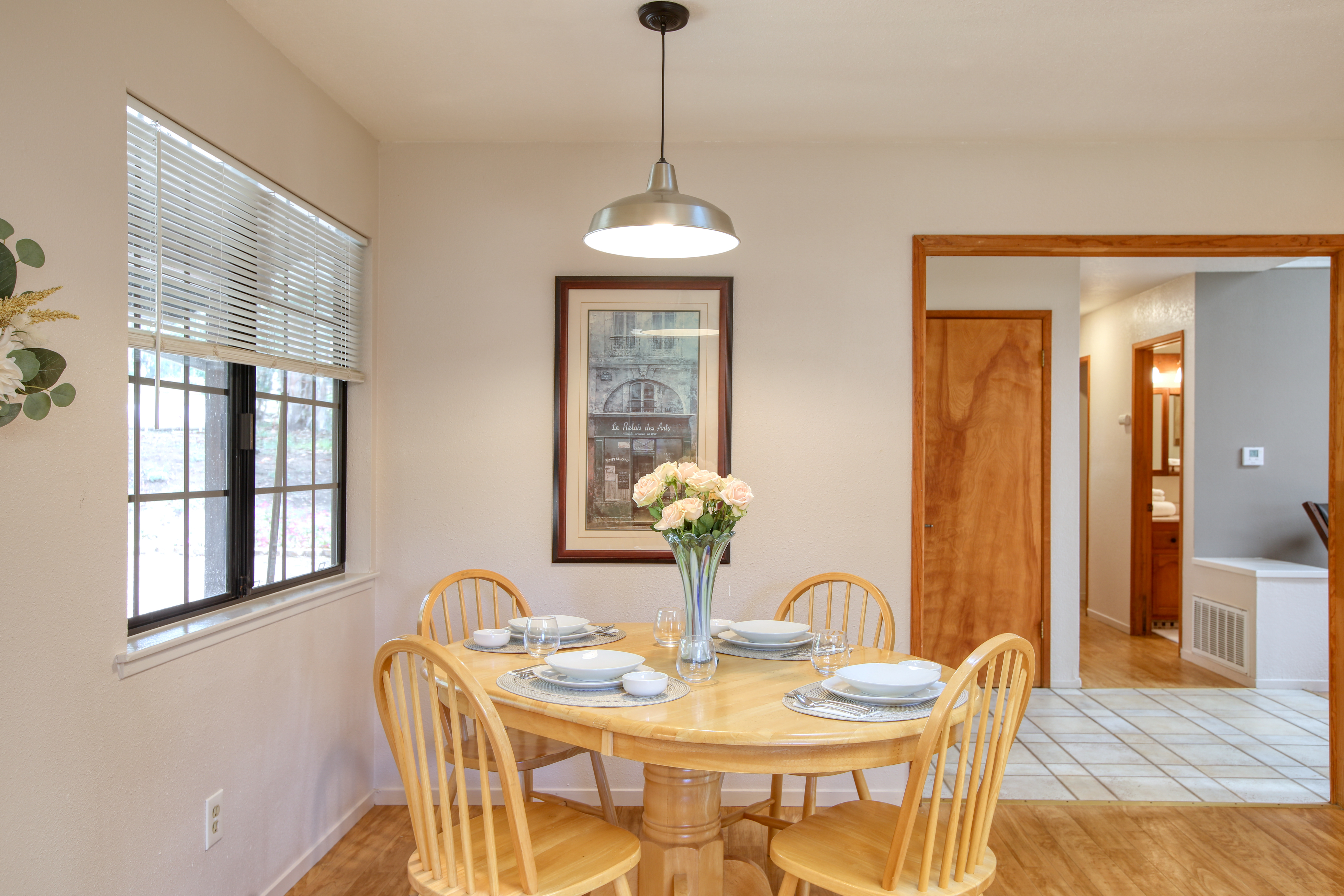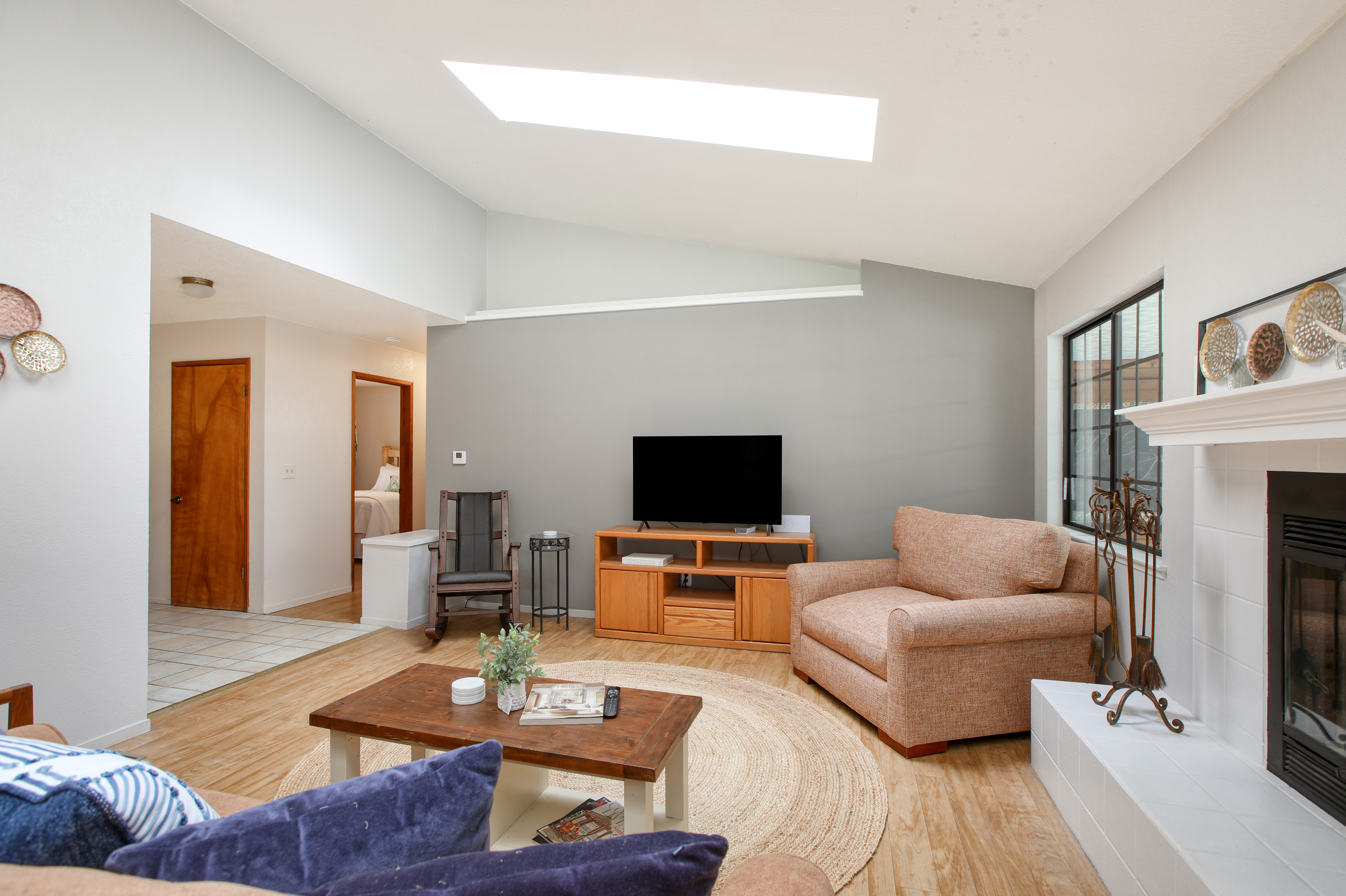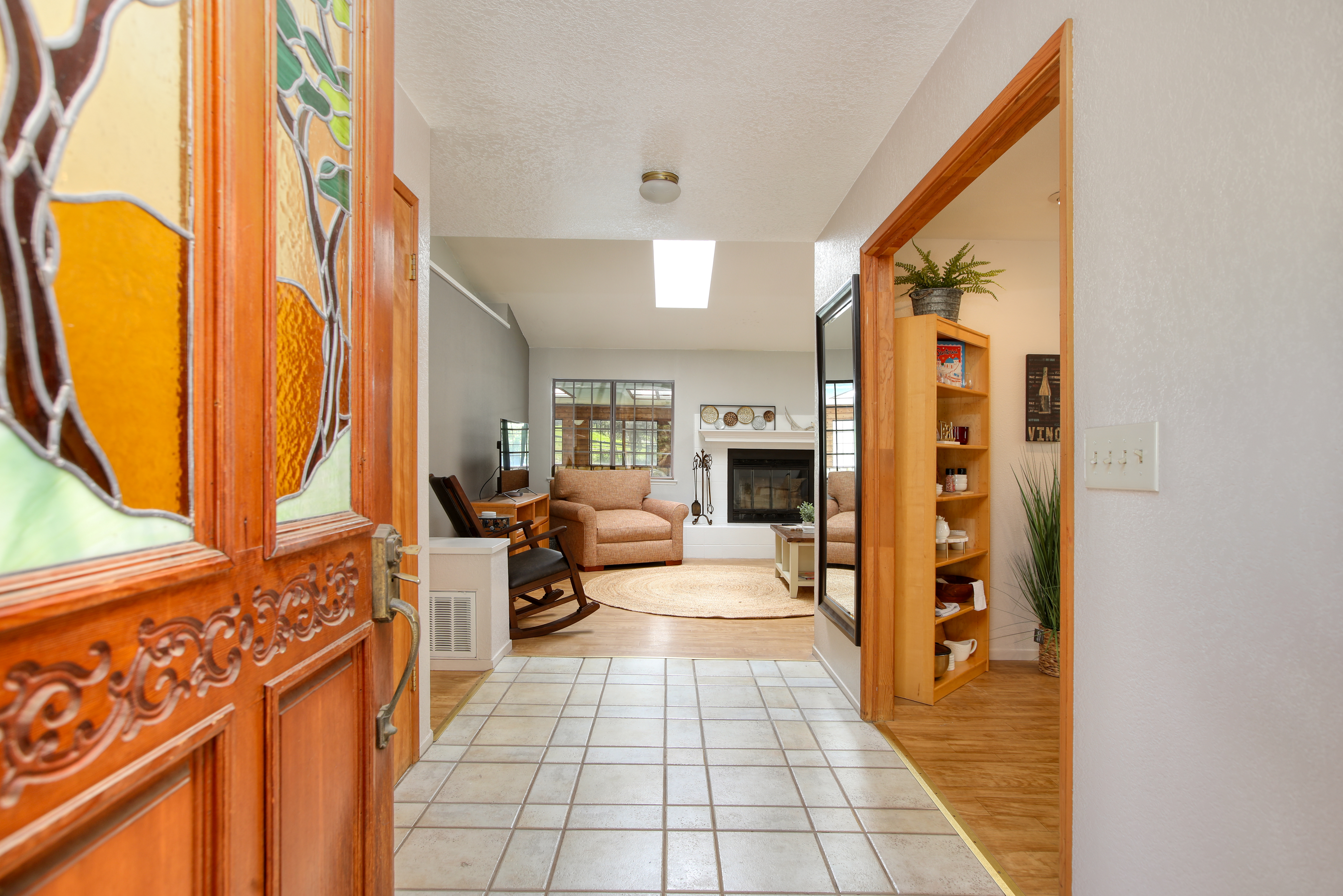Inside, the single-story layout is thoughtfully designed for both comfort and entertaining. The warm, inviting living room is anchored by a traditional wood-burning fireplace and large windows that look out over the solarium and the greenery beyond. The chef's kitchen comes fully equipped with high-end appliances, including a double oven, gas cooktop, and sleek Corian countertops, making it the perfect hub for hosting dinner parties. Each of the 3 spacious bedrooms feature a Queen size bed with comfortable linens and large closets. The second bathroom, located in the hallway just off the living area, includes a combination tub and shower and single sink. Between the kitchen and garage you'll find the combination laundry and utility room, with full-size front-loading washer and dryer, and this space also includes a roll-top desk perfect if you need to do some remote work during your visit. There is also a small water closet adjacent to the laundry area.