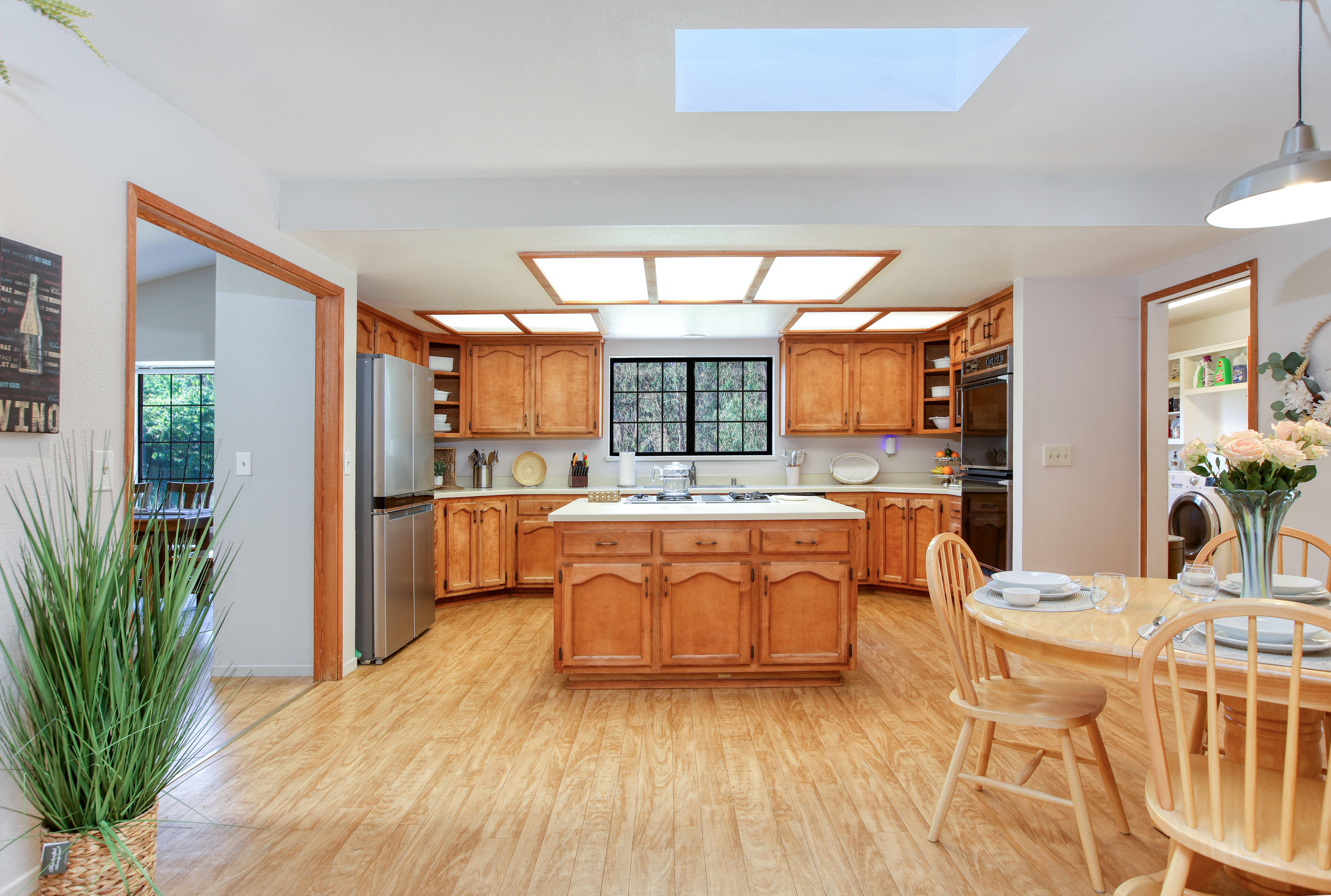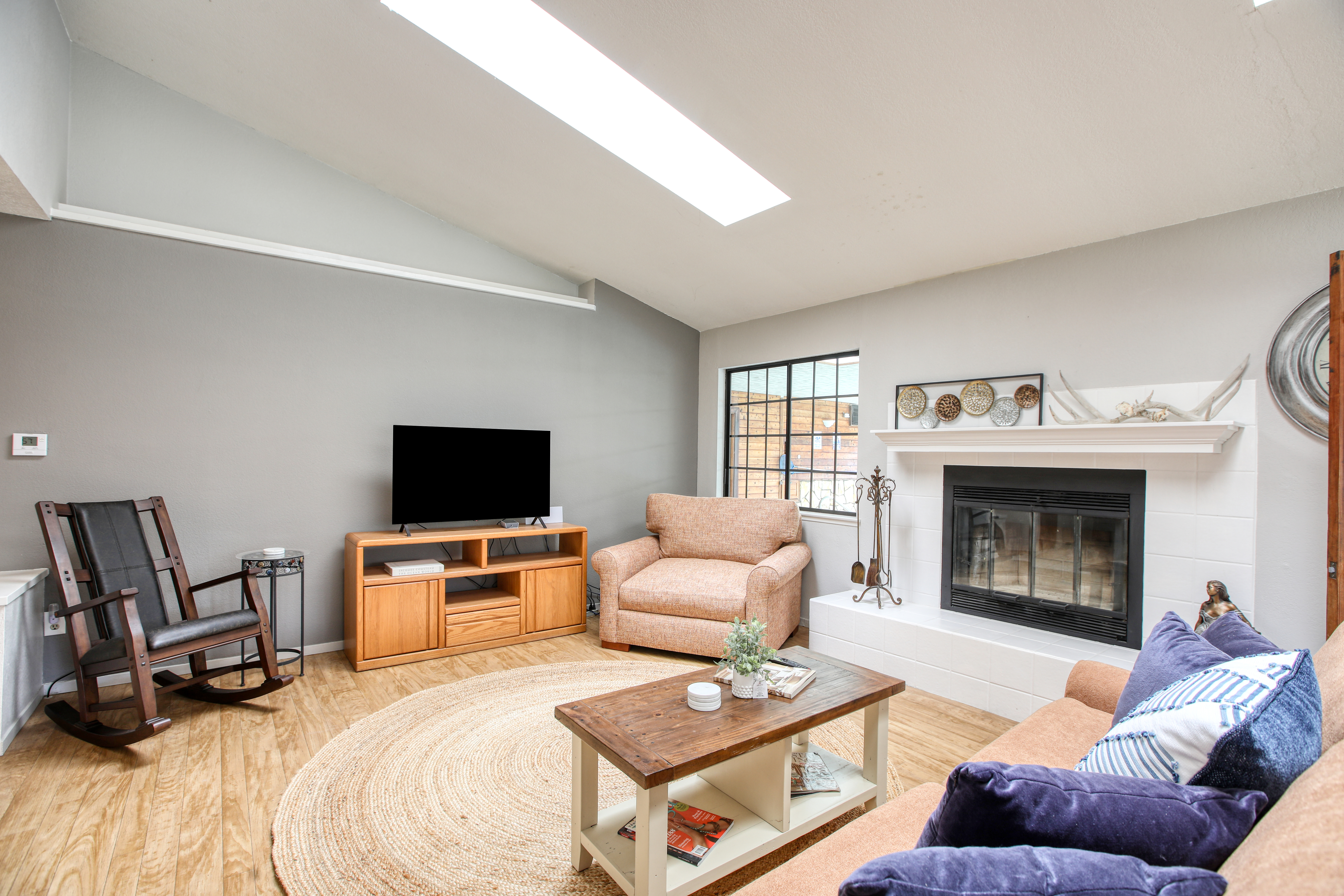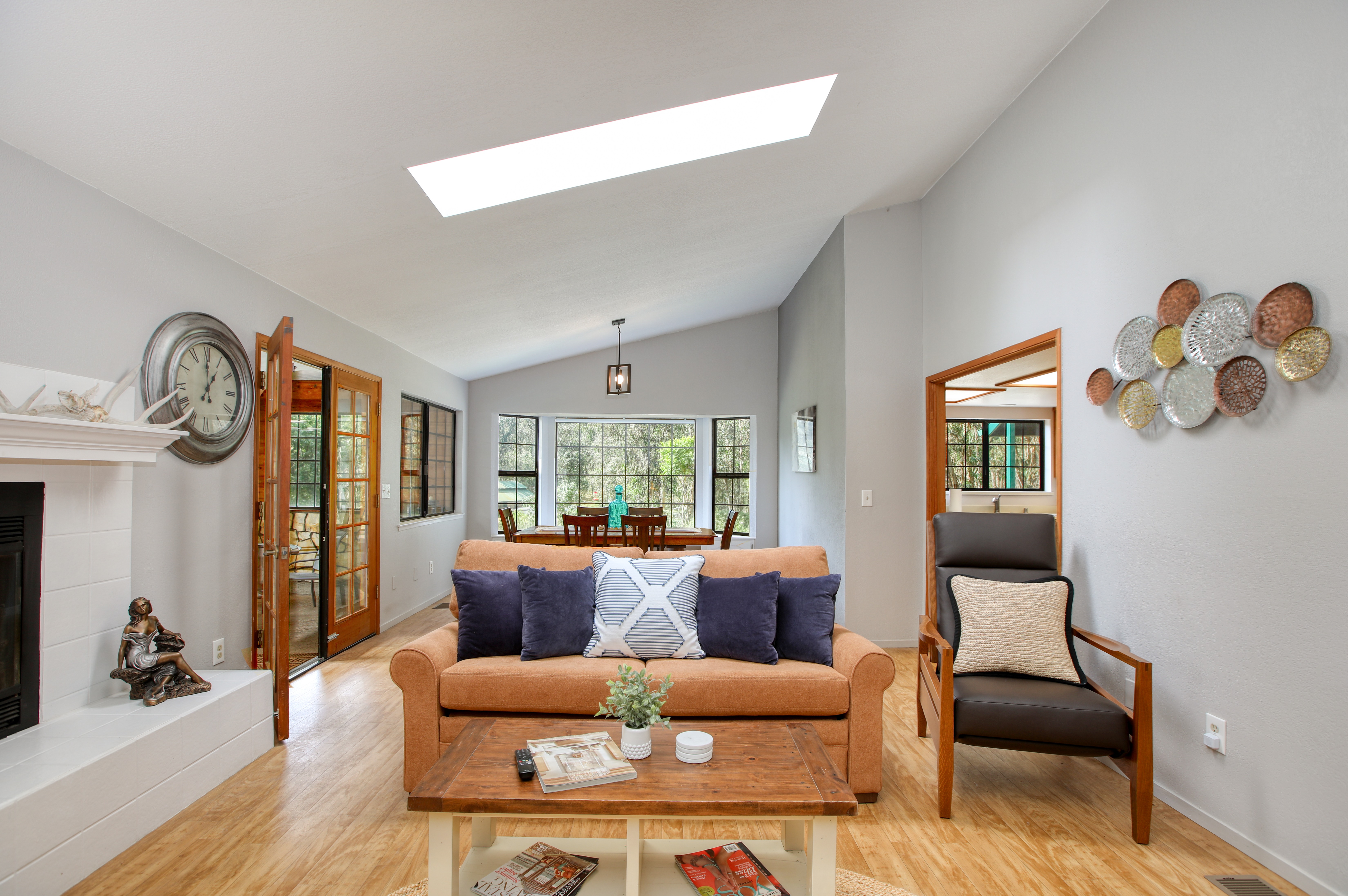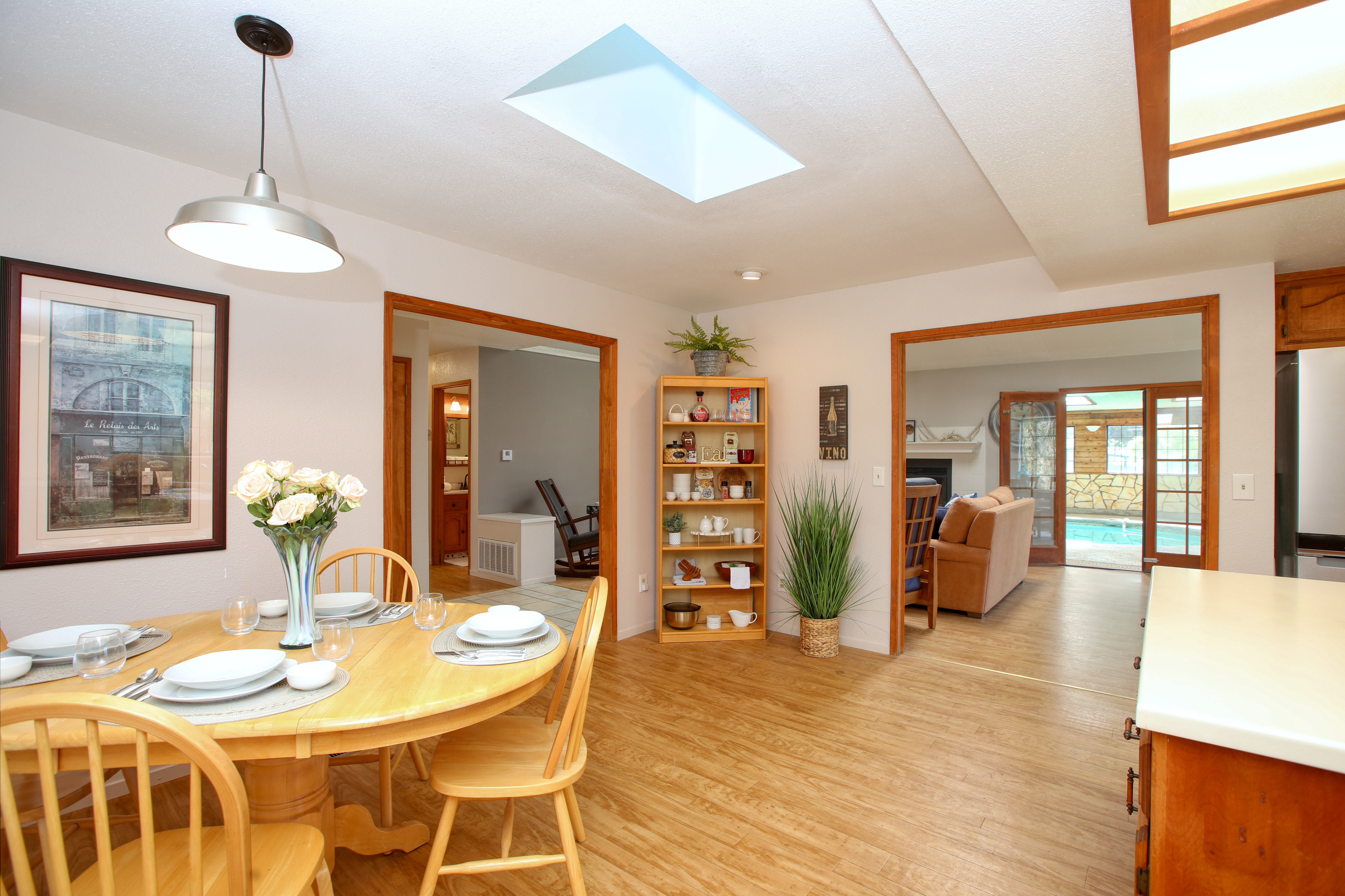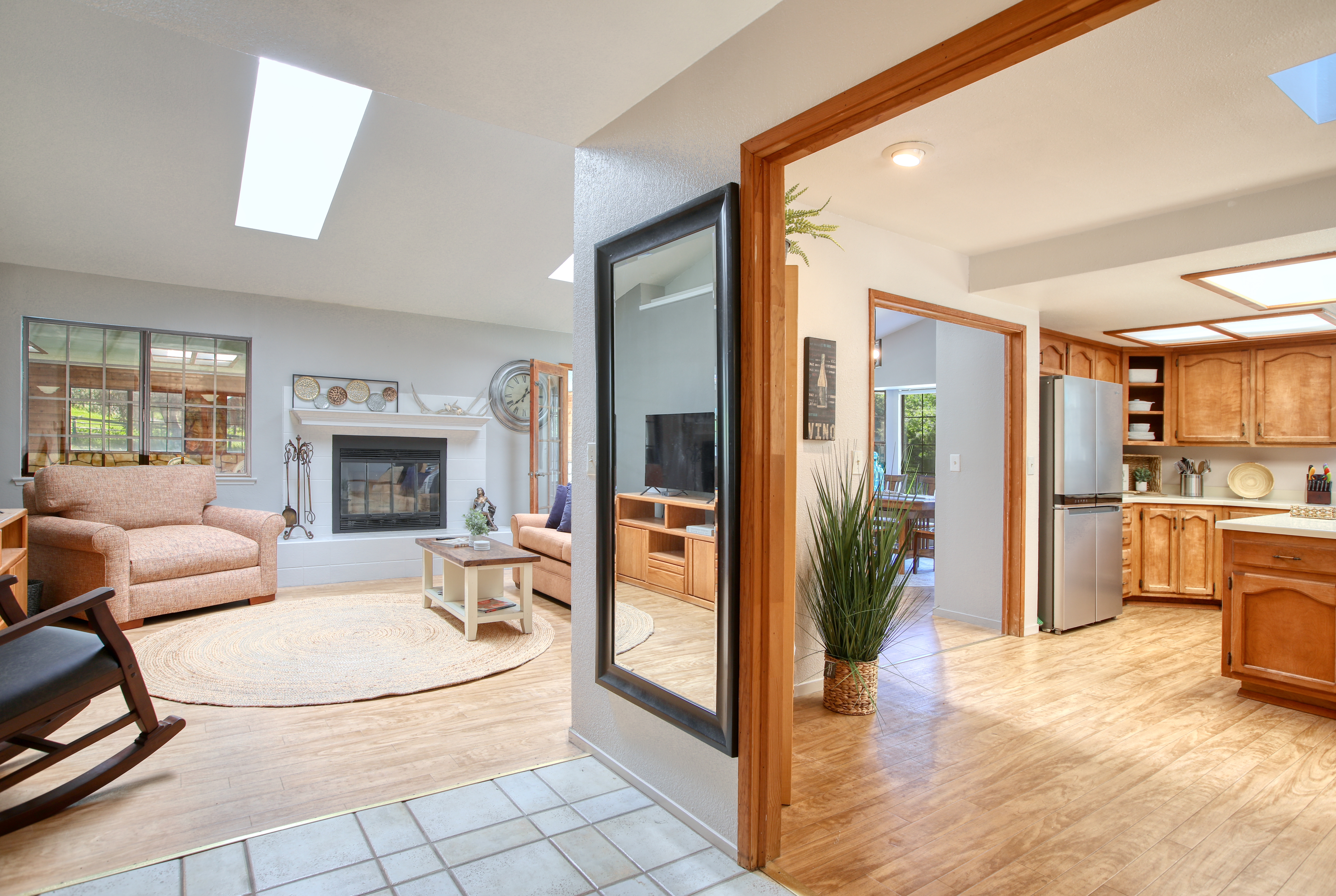 Inside, the single-story layout is thoughtfully designed for both comfort and entertaining. The warm, inviting living room is anchored by a traditional wood-burning fireplace and large windows that look out over the solarium and the greenery beyond. The chef's kitchen comes fully equipped with high-end appliances, including a double oven, gas cooktop, and sleek Corian countertops, making it the perfect hub for hosting dinner parties. Each of the 3 spacious bedrooms feature a Queen size bed with comfortable linens and large closets. The second bathroom, located in the hallway just off the living area, includes a combination tub and shower and single sink. Between the kitchen and garage you'll find the combination laundry and utility room, with full-size front-loading washer and dryer, and this space also includes a roll-top desk perfect if you need to do some remote work during your visit. There is also a small water closet adjacent to the laundry area.