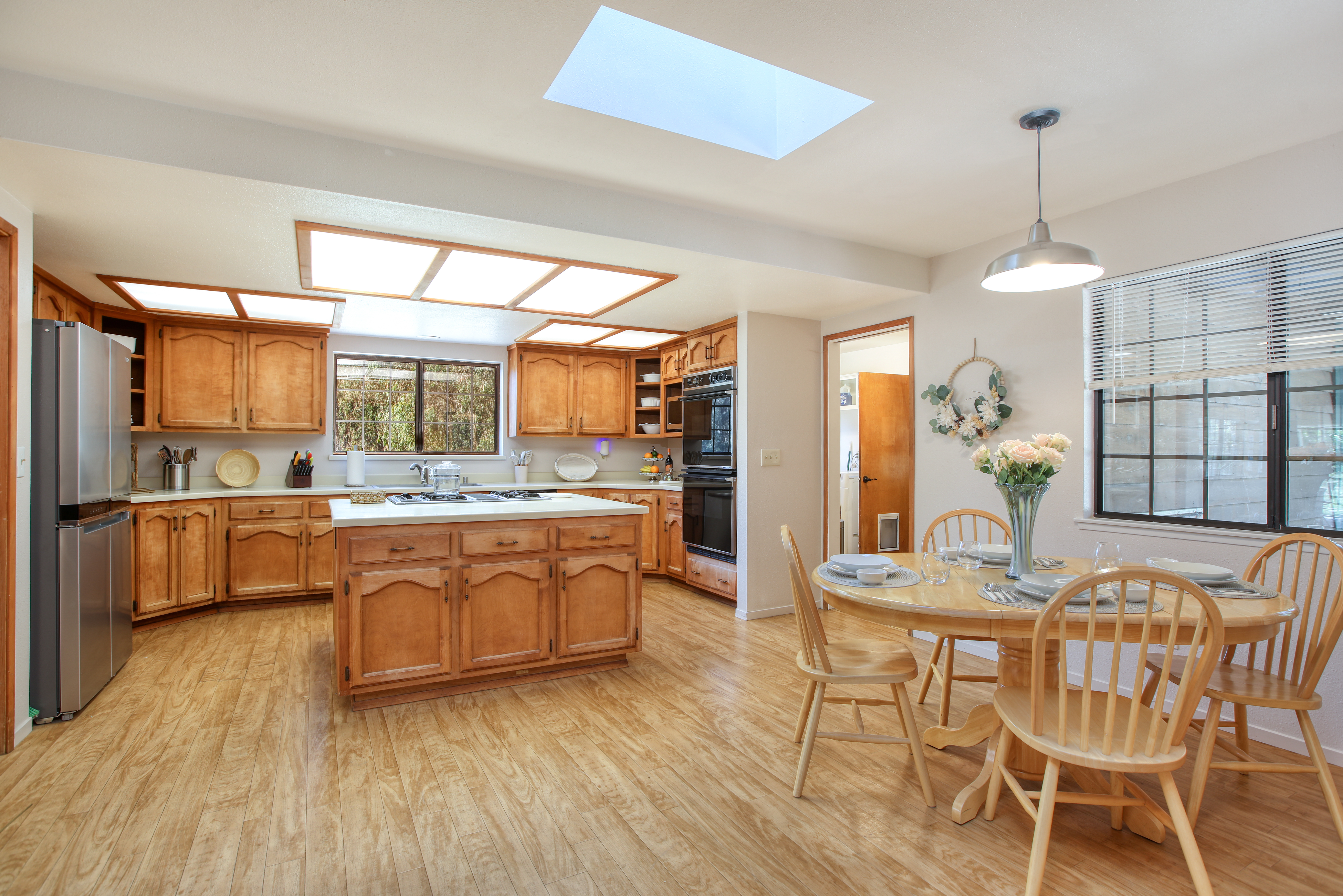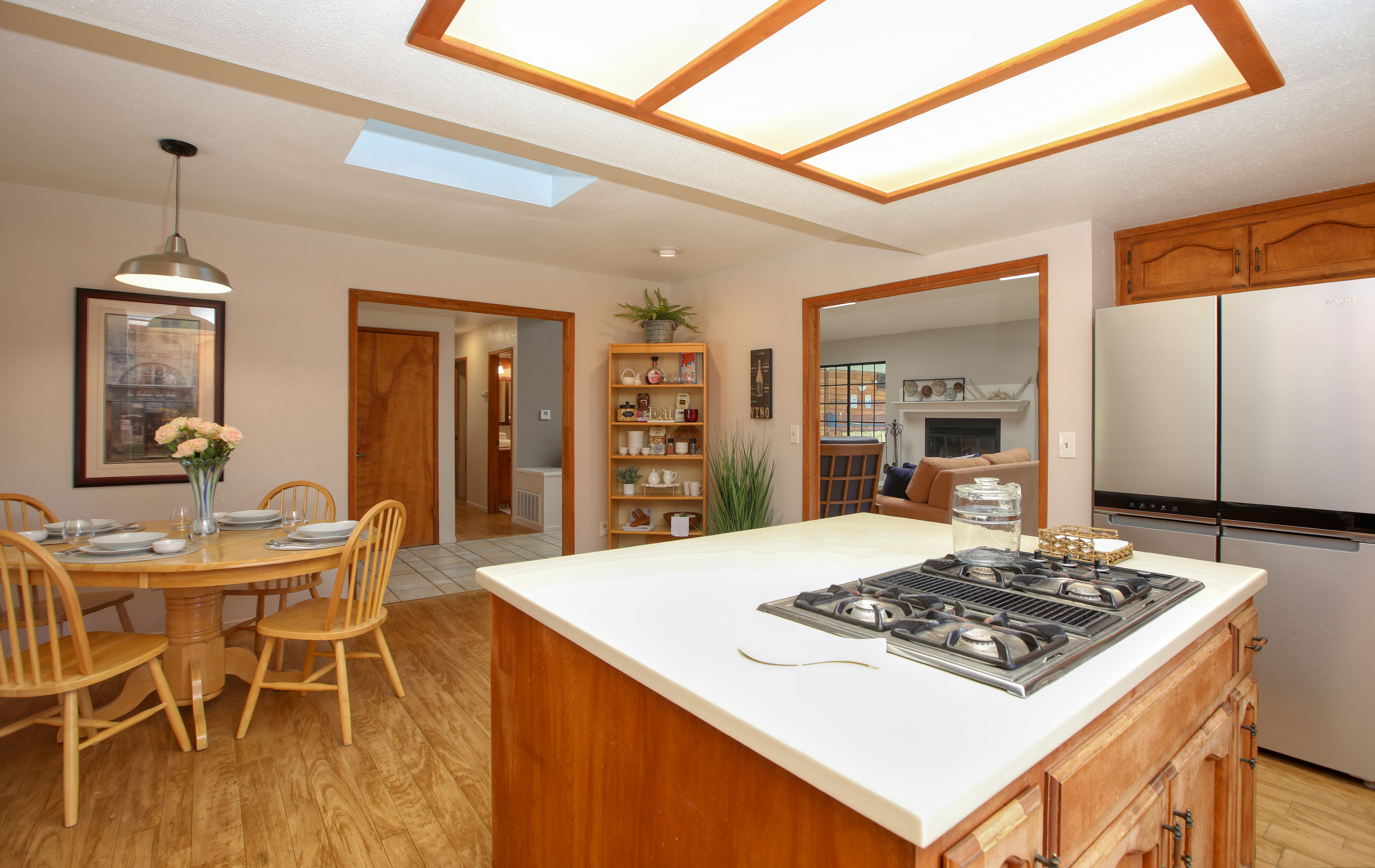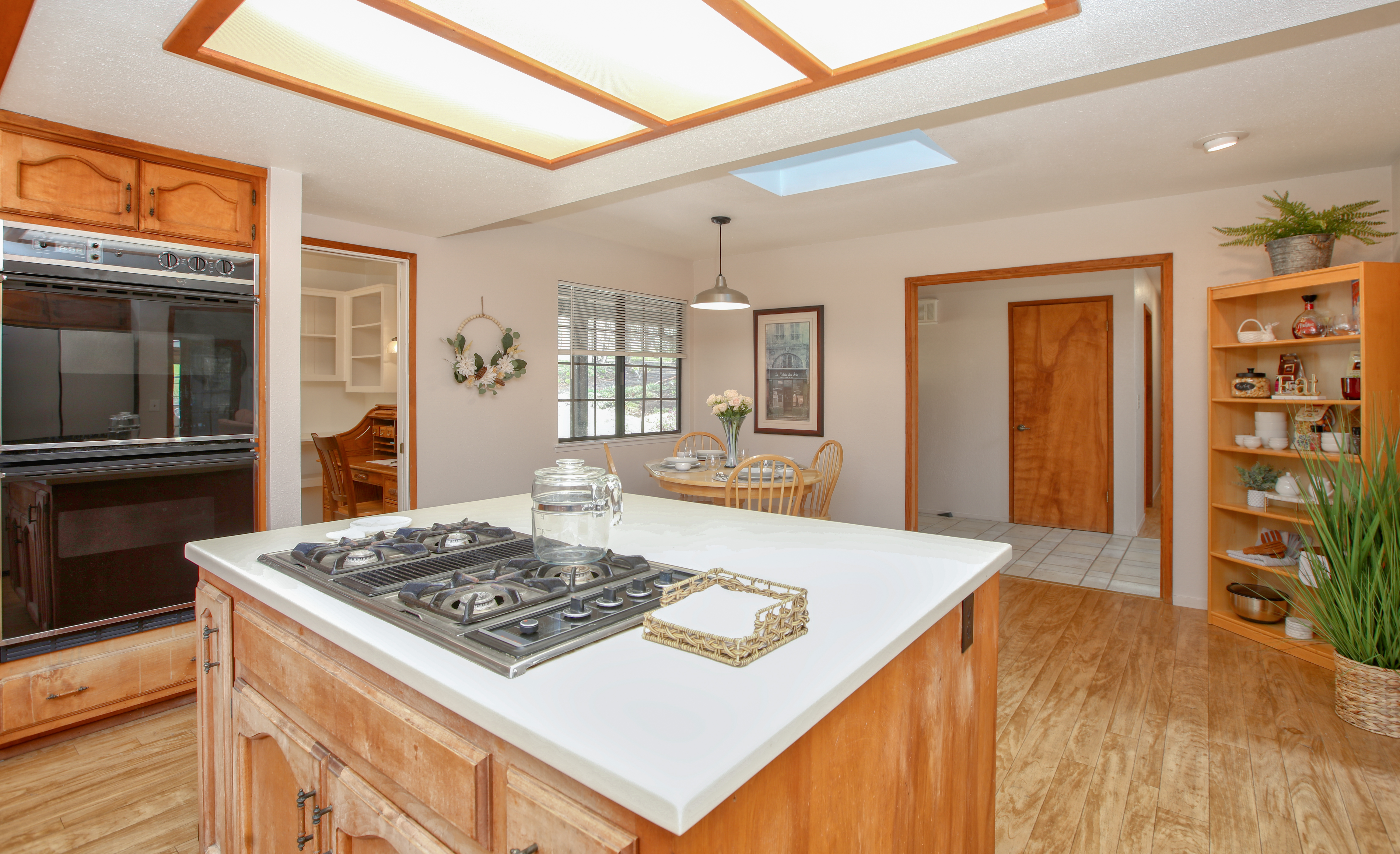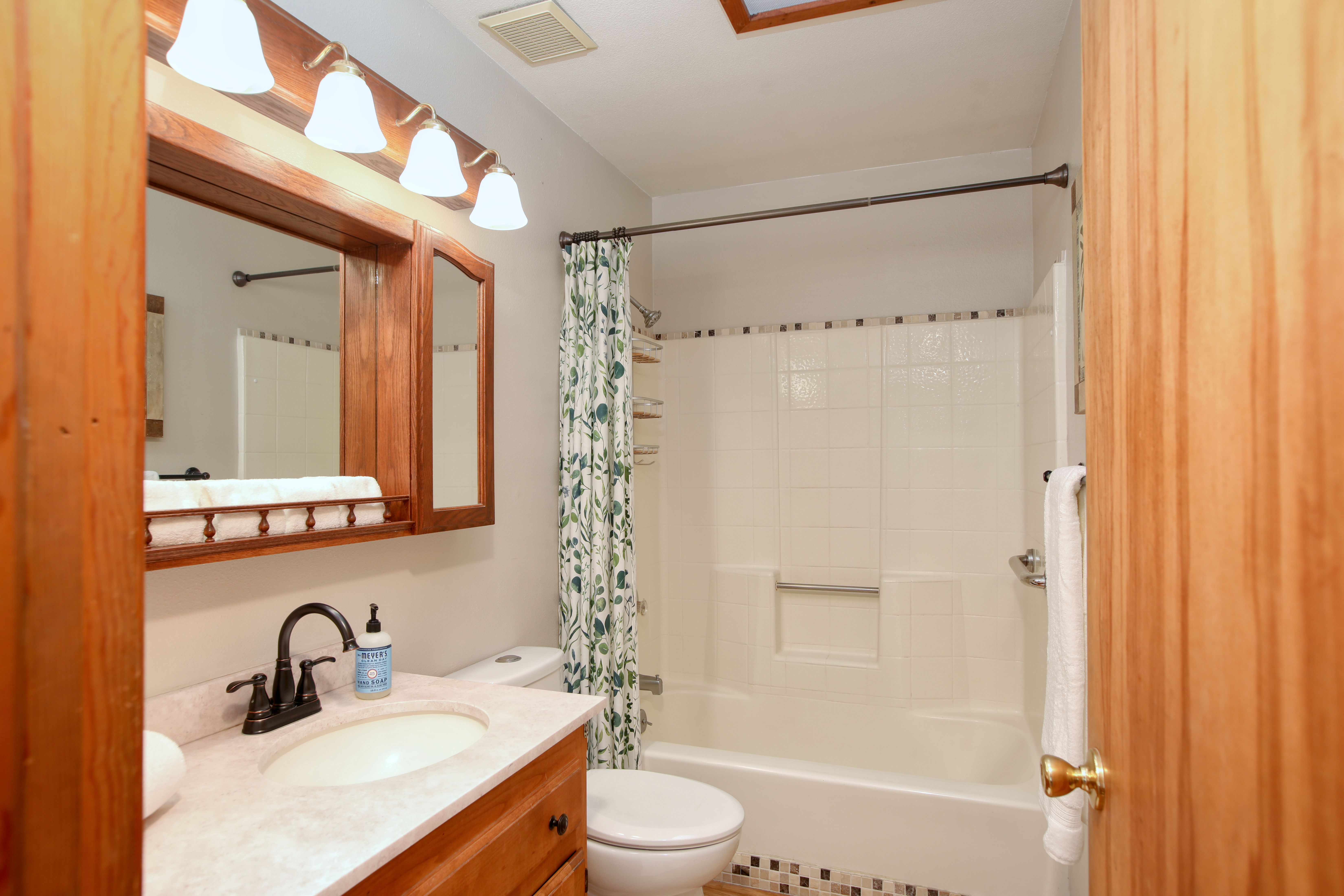 Inside, the single-story layout is thoughtfully designed for both comfort and entertaining. The warm, inviting living room is anchored by a traditional wood-burning fireplace and large windows that look out over the solarium and the greenery beyond. The chef's kitchen comes fully equipped with high-end appliances, including a double oven, gas cooktop, and sleek Corian countertops, making it the perfect hub for hosting dinner parties. Each of the 3 spacious bedrooms feature a Queen size bed with comfortable linens and large closets. The second bathroom, located in the hallway just off the living area, includes a combination tub and shower and single sink. Between the kitchen and garage you'll find the combination laundry and utility room, with full-size front-loading washer and dryer, and this space also includes a roll-top desk perfect if you need to do some remote work during your visit. There is also a small water closet adjacent to the laundry area.
