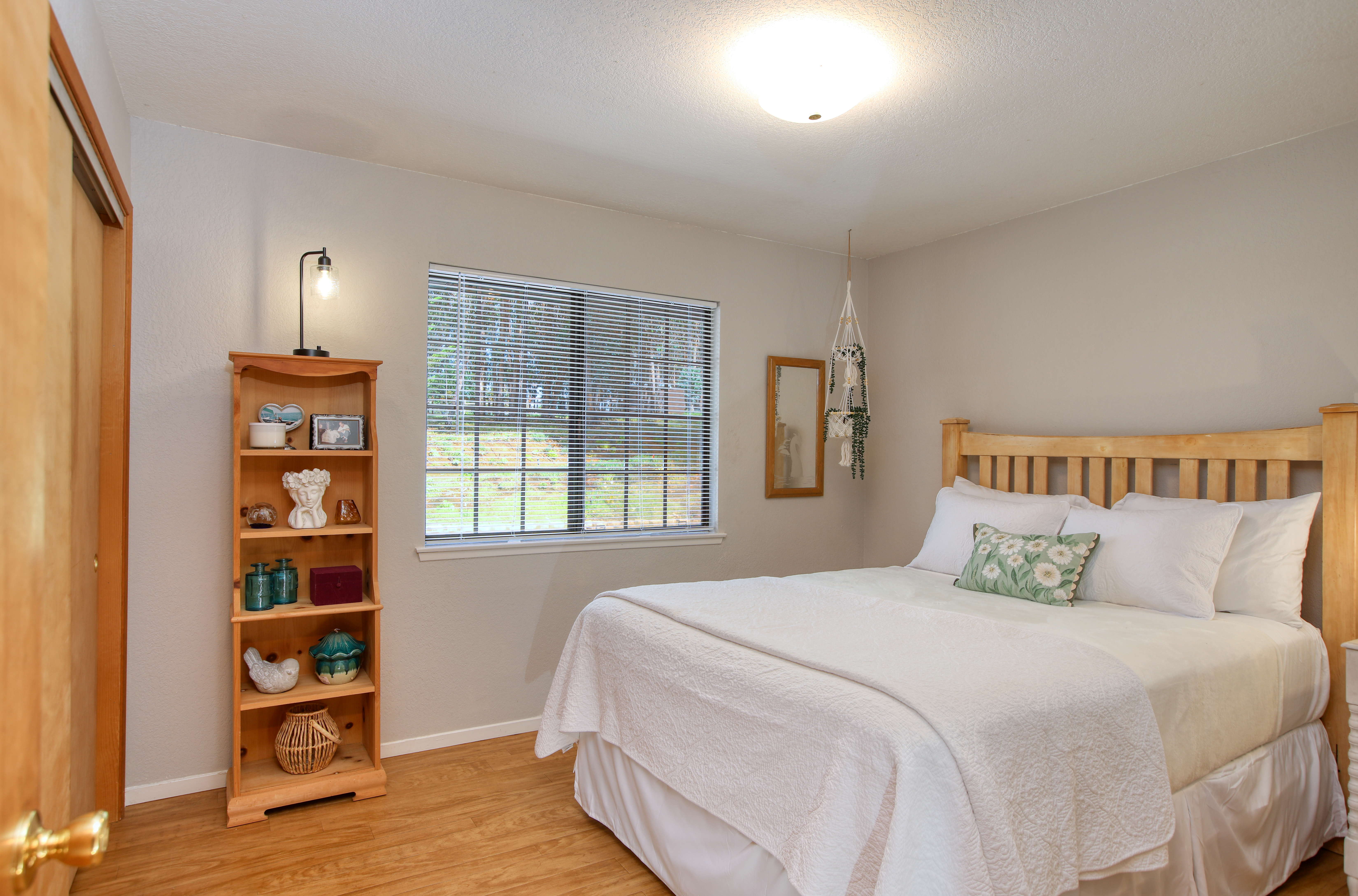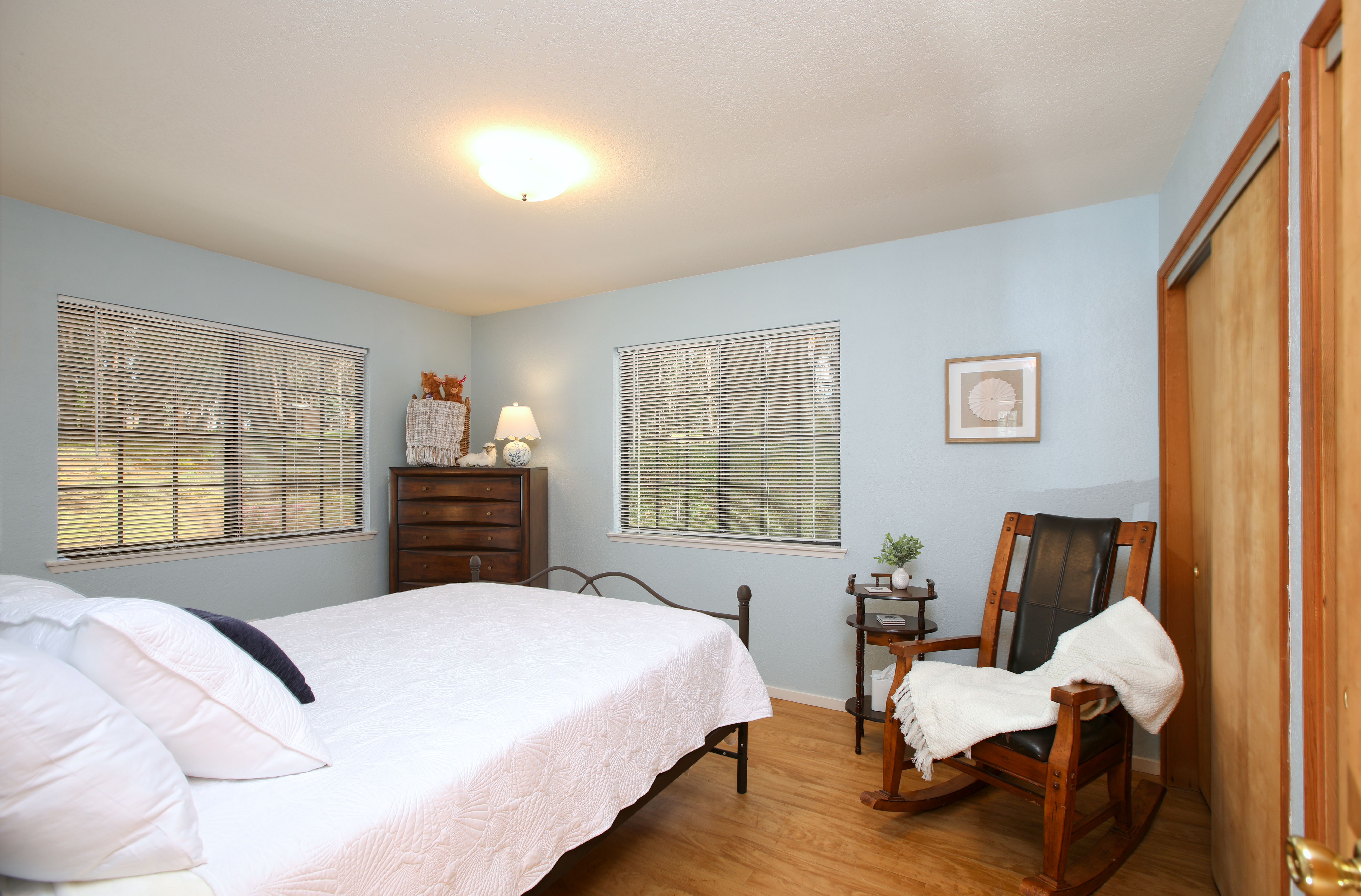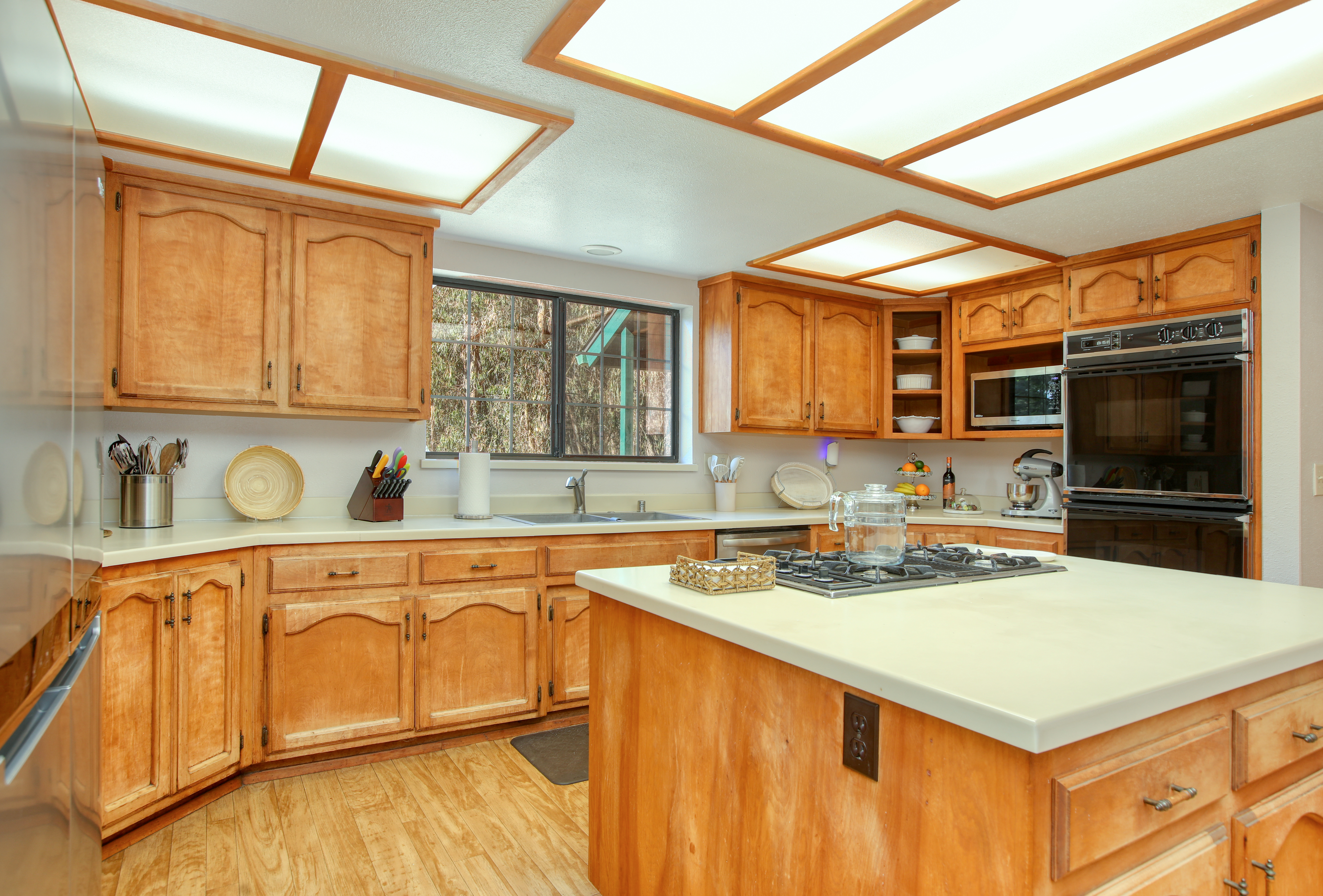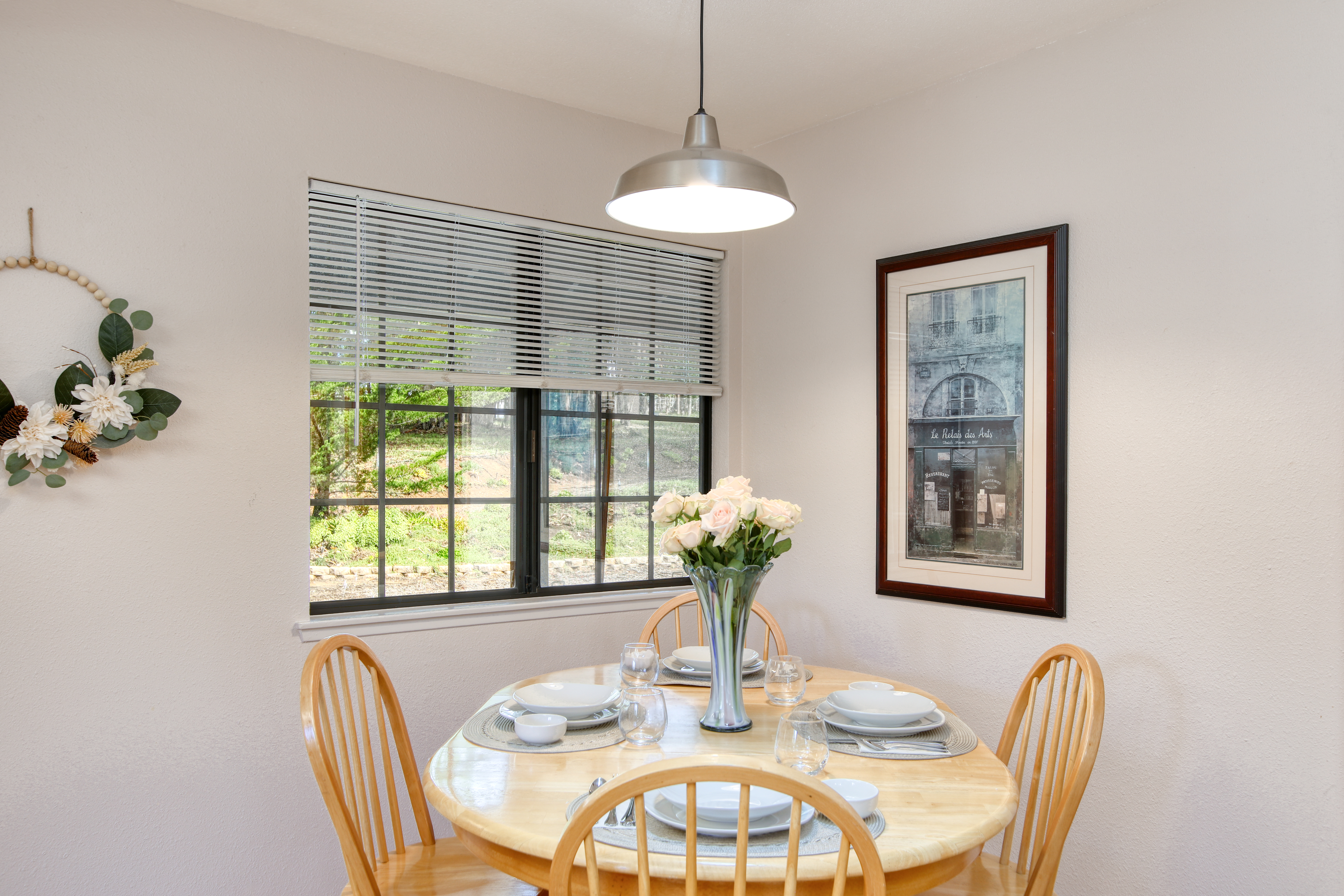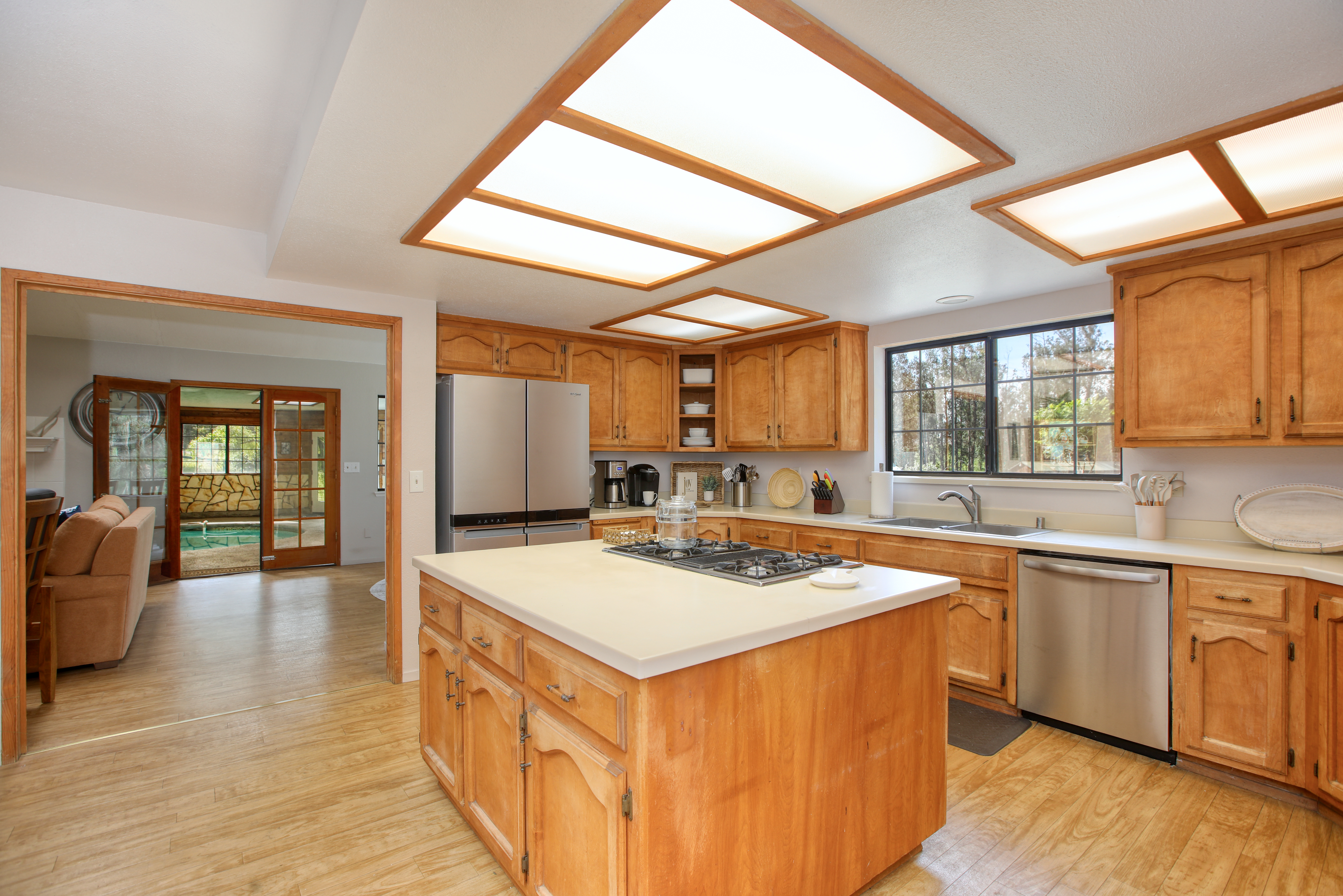 Inside, the single-story layout is thoughtfully designed for both comfort and entertaining. The warm, inviting living room is anchored by a traditional wood-burning fireplace and large windows that look out over the solarium and the greenery beyond. The chef's kitchen comes fully equipped with high-end appliances, including a double oven, gas cooktop, and sleek Corian countertops, making it the perfect hub for hosting dinner parties. Each of the 3 spacious bedrooms feature a Queen size bed with comfortable linens and large closets. The second bathroom, located in the hallway just off the living area, includes a combination tub and shower and single sink. Between the kitchen and garage you'll find the combination laundry and utility room, with full-size front-loading washer and dryer, and this space also includes a roll-top desk perfect if you need to do some remote work during your visit. There is also a small water closet adjacent to the laundry area.
