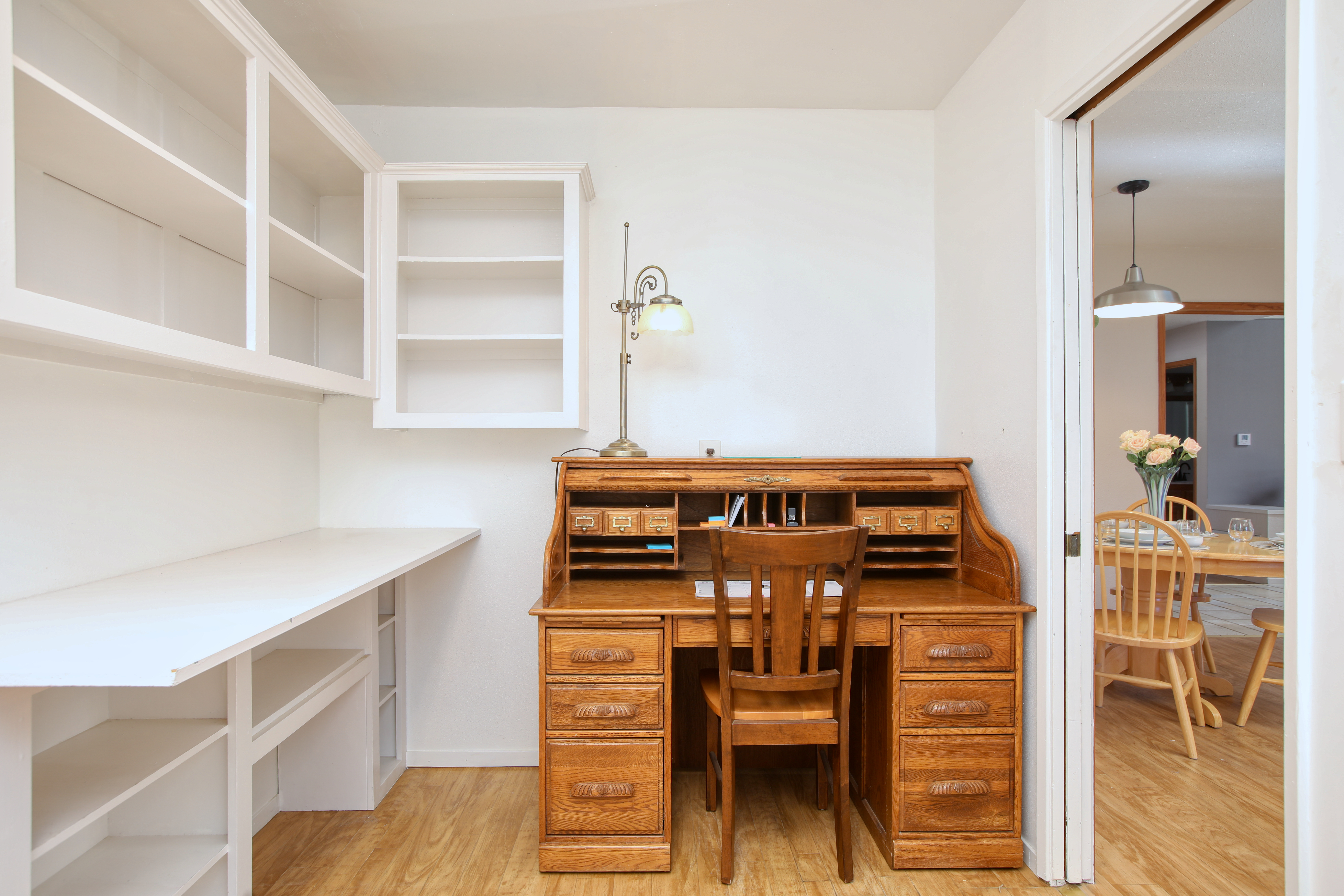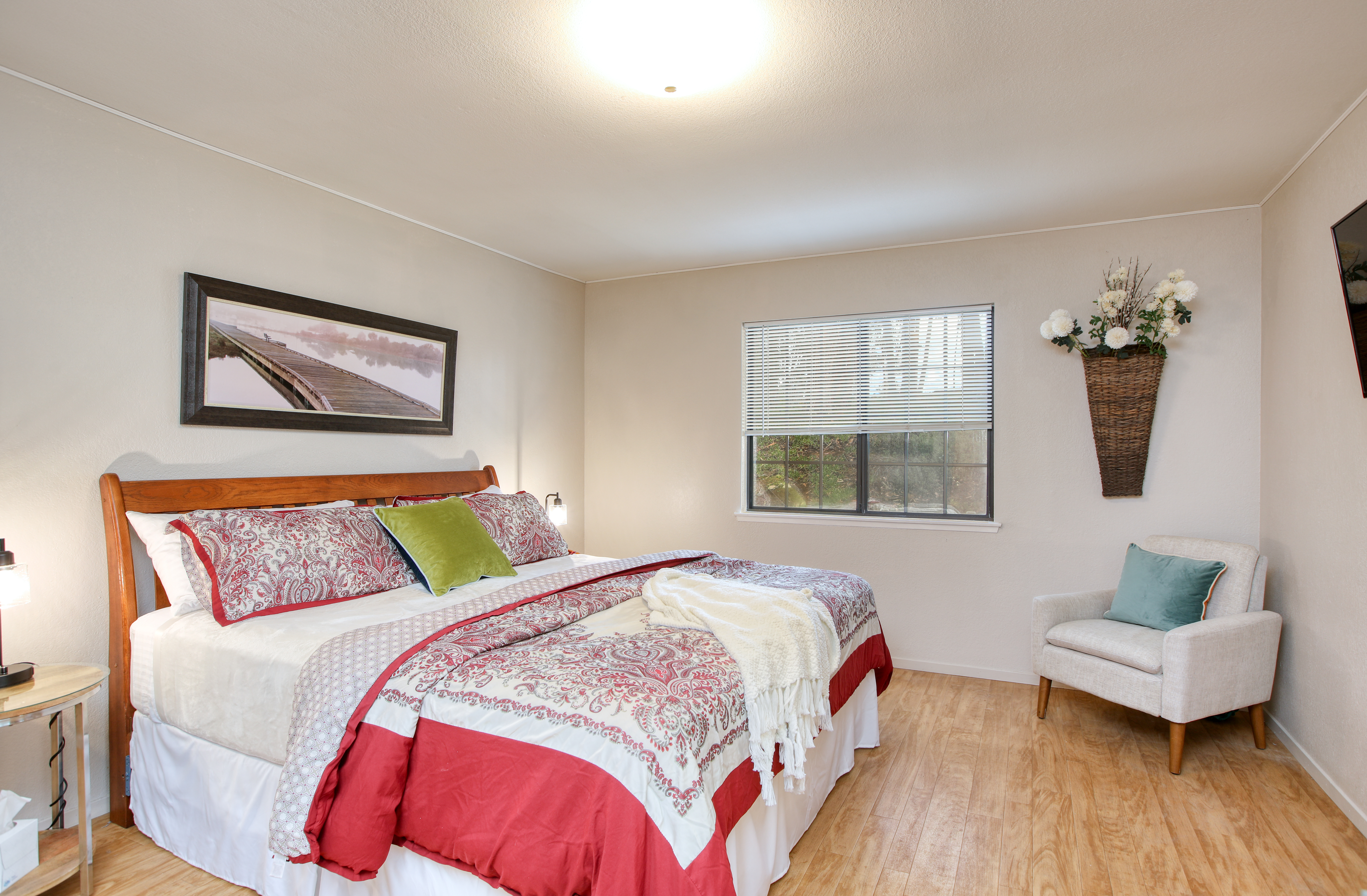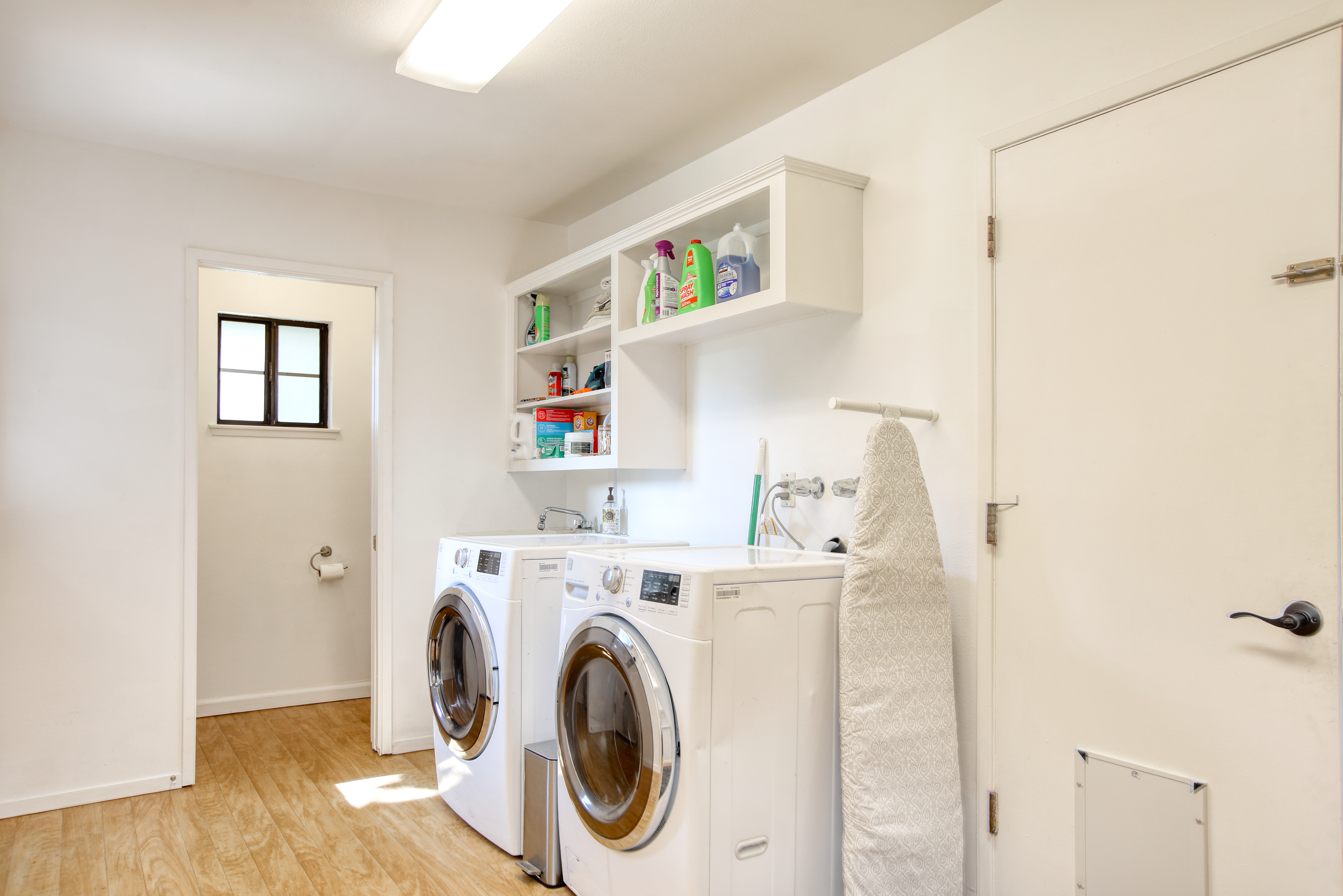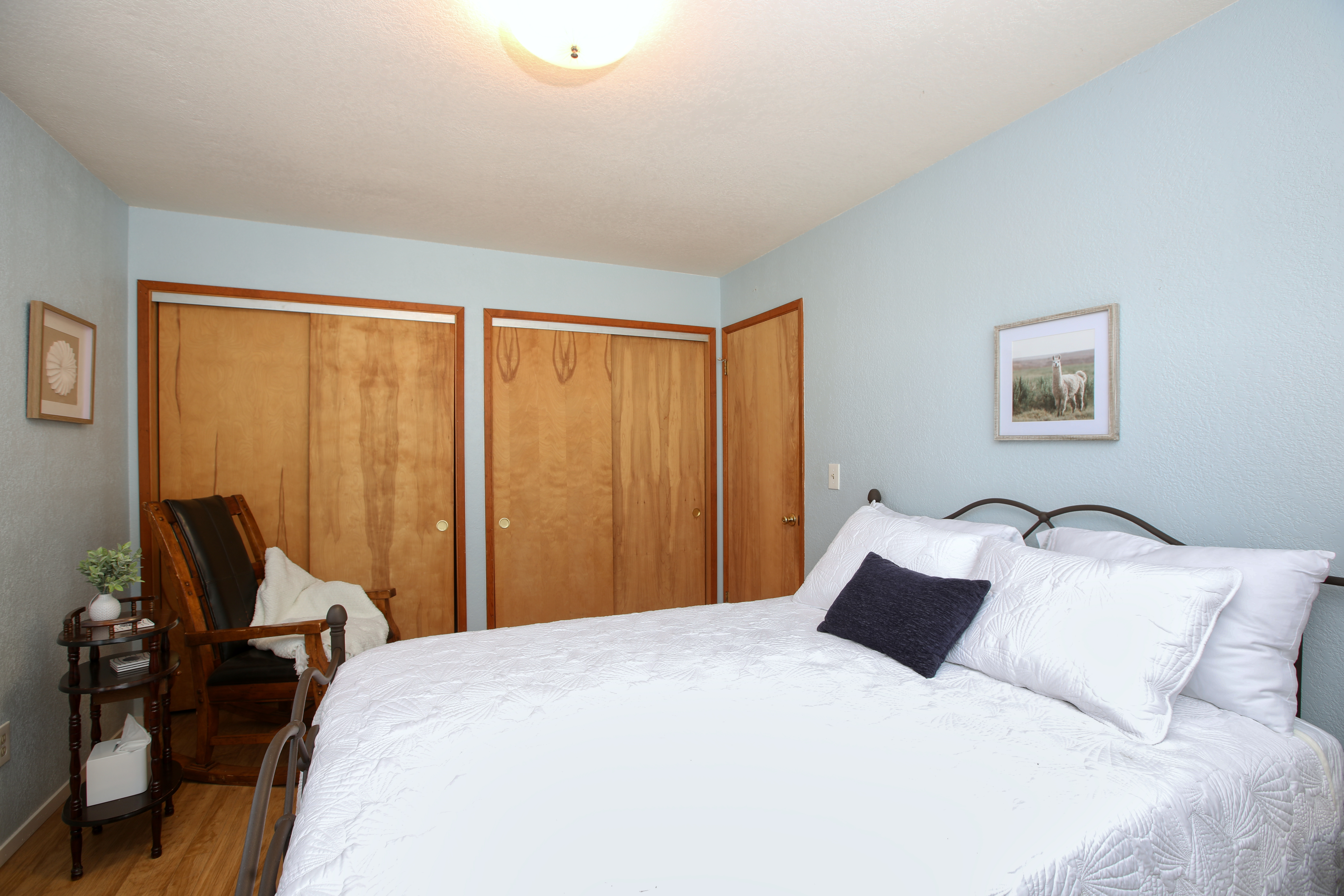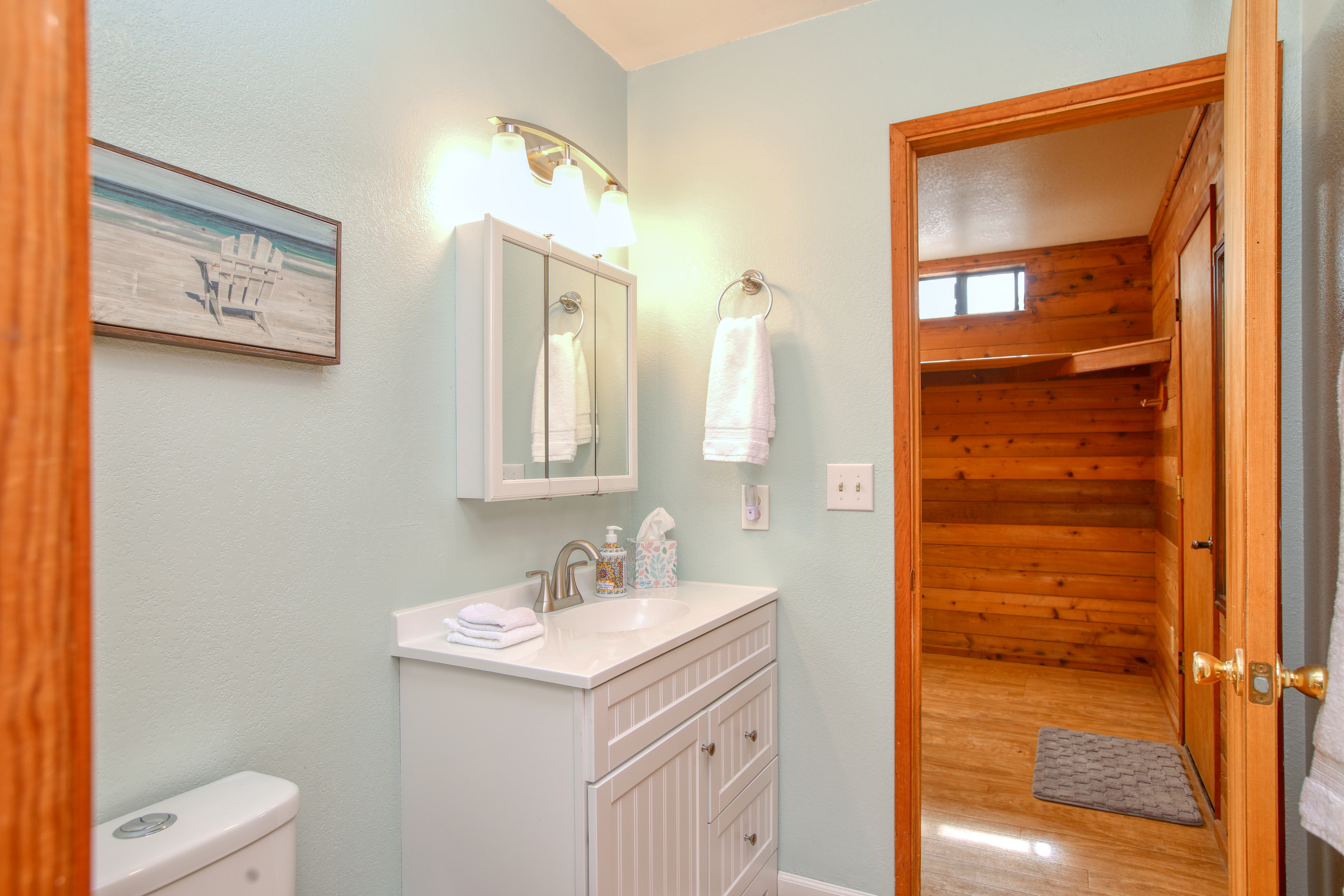 Inside, the single-story layout is thoughtfully designed for both comfort and entertaining. The warm, inviting living room is anchored by a traditional wood-burning fireplace and large windows that look out over the solarium and the greenery beyond. The chef's kitchen comes fully equipped with high-end appliances, including a double oven, gas cooktop, and sleek Corian countertops, making it the perfect hub for hosting dinner parties. Each of the 3 spacious bedrooms feature a Queen size bed with comfortable linens and large closets. The second bathroom, located in the hallway just off the living area, includes a combination tub and shower and single sink. Between the kitchen and garage you'll find the combination laundry and utility room, with full-size front-loading washer and dryer, and this space also includes a roll-top desk perfect if you need to do some remote work during your visit. There is also a small water closet adjacent to the laundry area.
