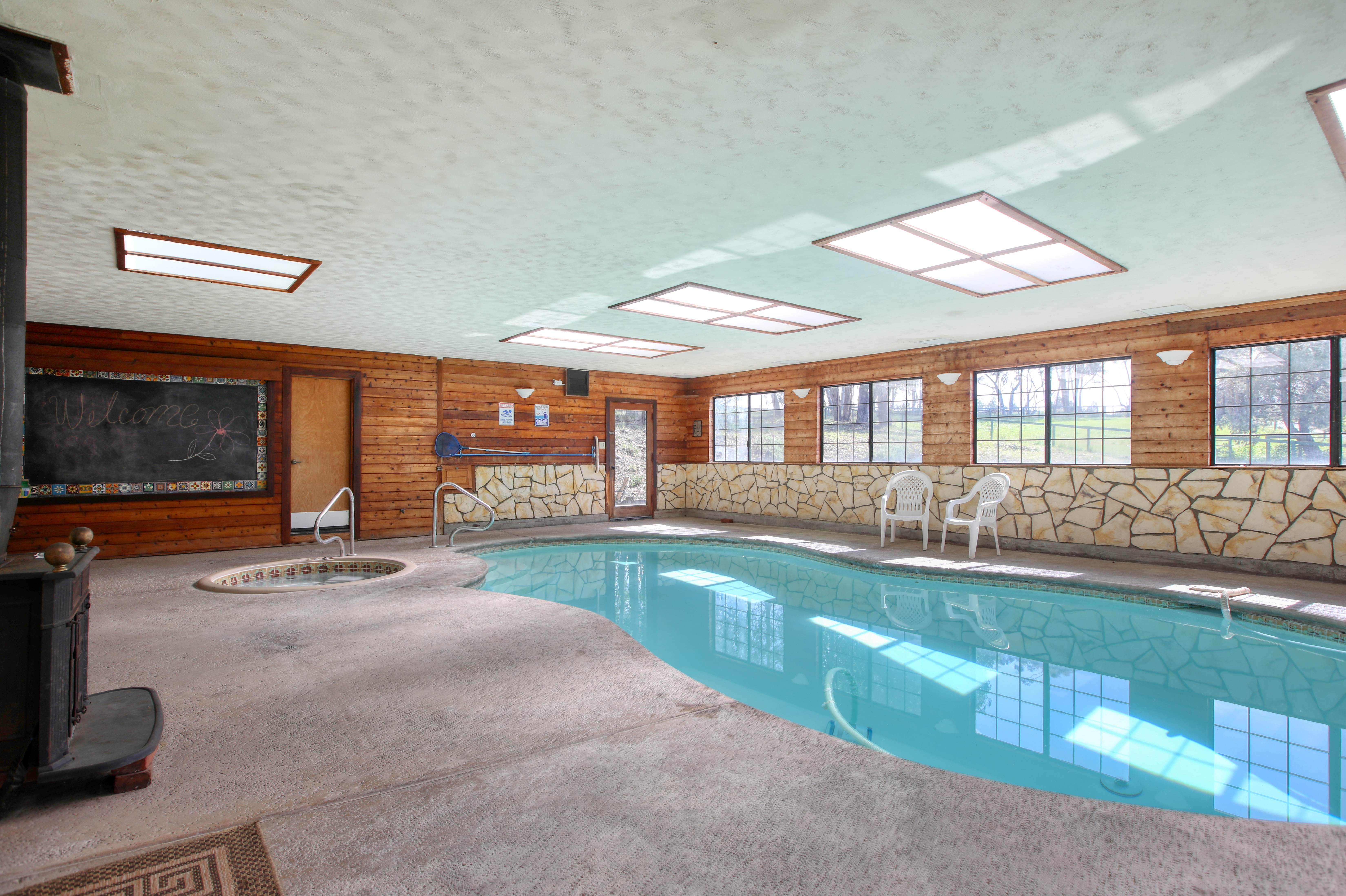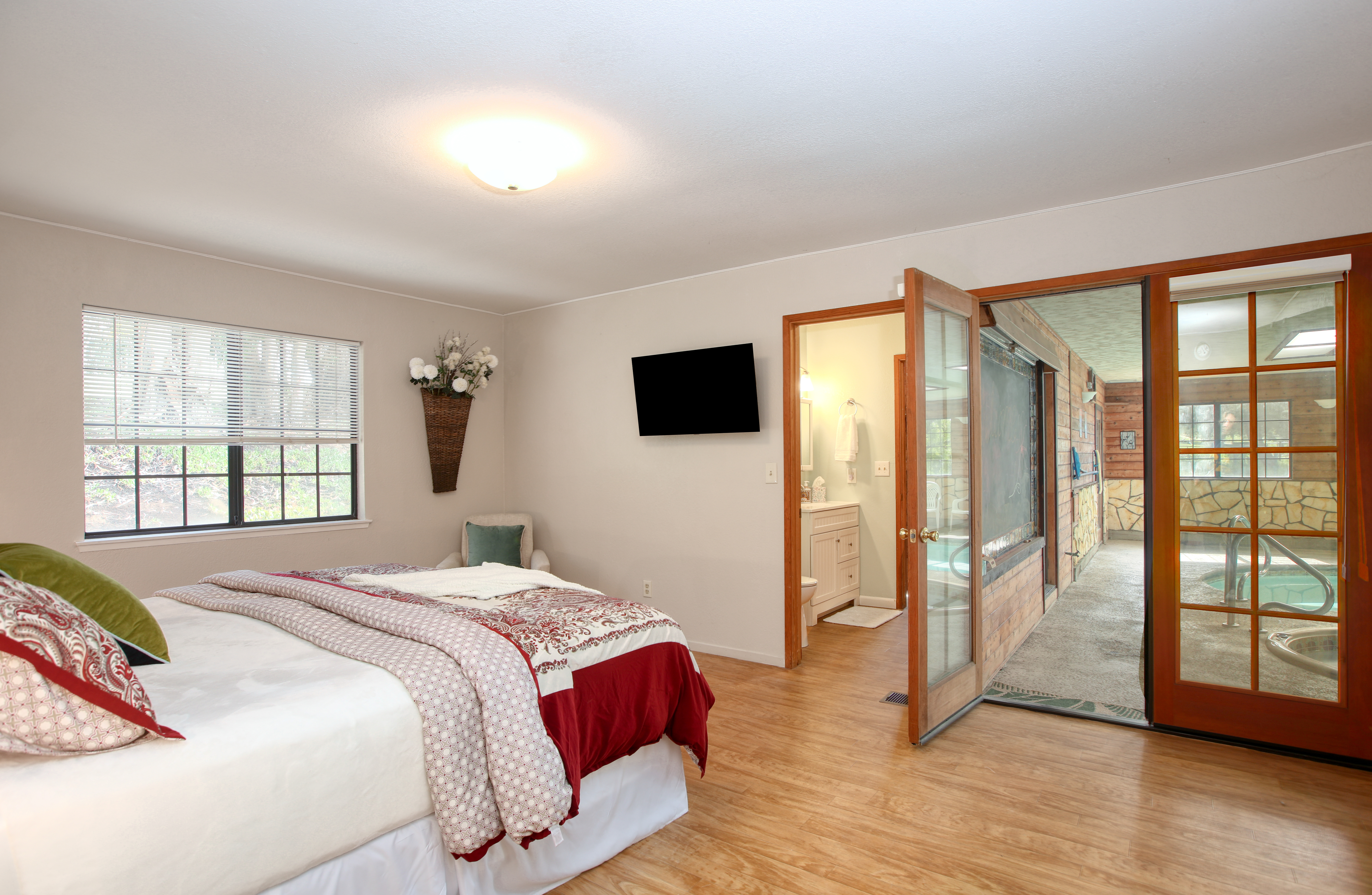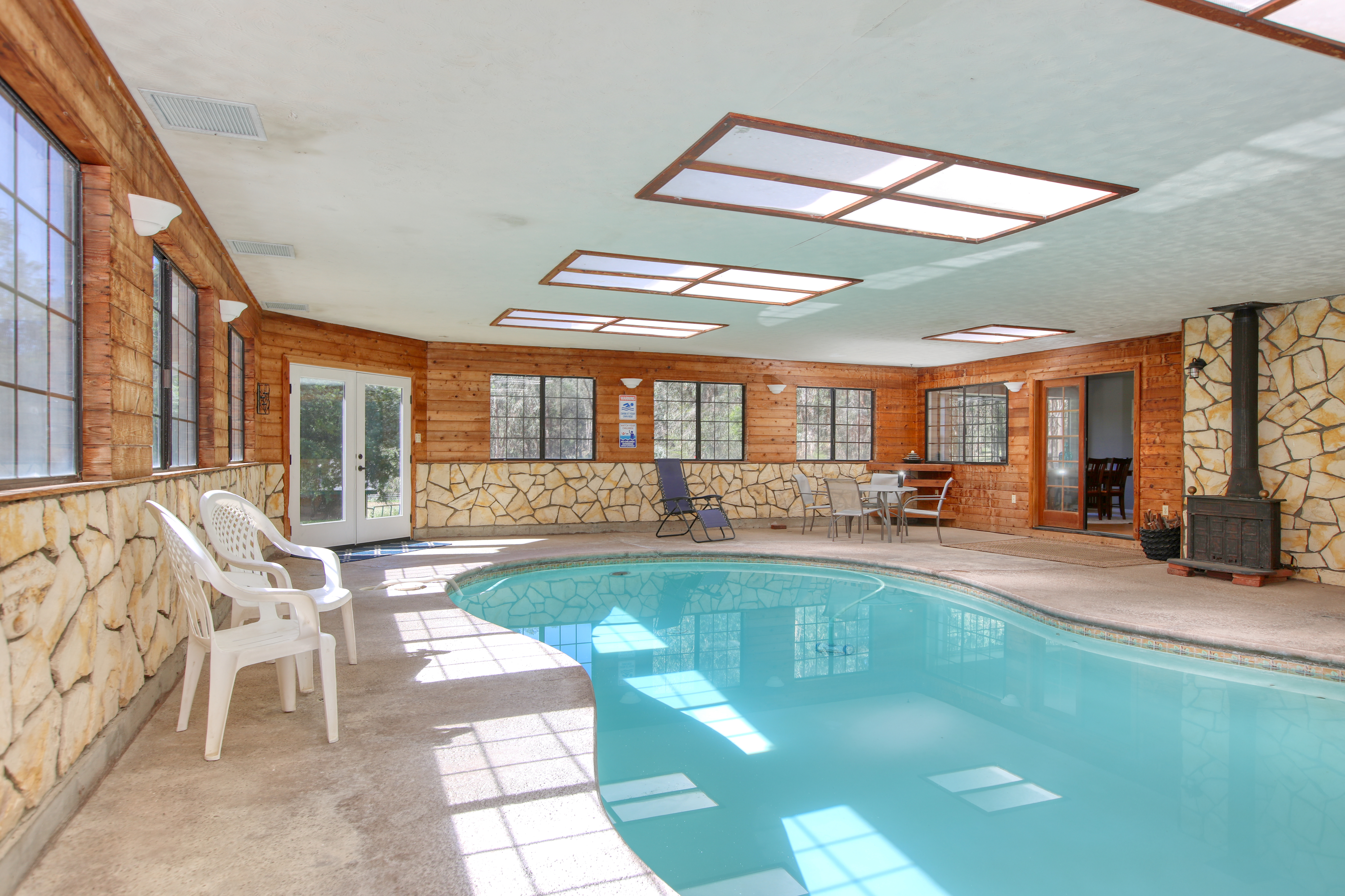 The crown jewel of this home is the spectacular indoor solarium, featuring a solar-heated swimming pool and an integrated spa. Flooded with natural light from overhead skylights, this magnificent space allows for year-round swimming. Enjoy the private sauna located in the primary bedroom suite to promote your wellness and relaxation, or light the wood-burning stove in the pool room to create a cozy, spa-like atmosphere during crisp California evenings.